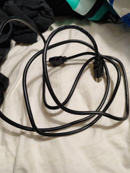 Svart HDMI-kabel med texten "HIGH SPEED HDMI CABLE" och specifikationerna "AWM STYLE 20276 80C 30V E324703" tryckt på kabeln.
