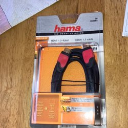 Svart HDMI-kabel för anslutning av olika enheter. Kabeln är märkt "High Speed HDMI™ Cable E340033 AWM STYLE".