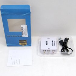 Converterar från HDMI till AV (RCA) signal. Har spak för att ändra mellan NTSC och PAL format. Drivs med USB ström (strömsladd medföljer men ej laddare).