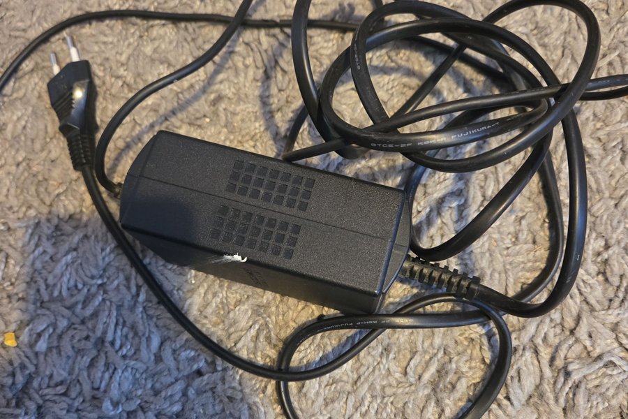 Strömadapter med en svart kabel. Adaptern är svart och har en standard stickkontakt för vägguttag.