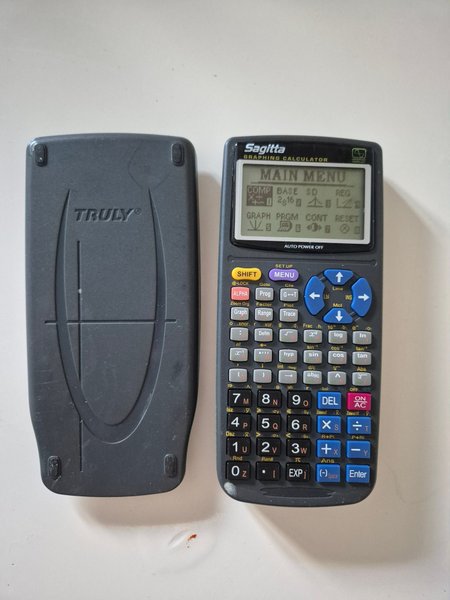 Sagitta grafräknare med "MAIN MENU" visat på skärmen. Räknaren har funktioner som COMP, BASE, SD, REG, GRAPH, PRGM, CONT, RESET. Knapparna inkluderar SHIFT, ALPHA, MENU, piltangenter, samt numeriska och matematiska funktioner. Modellen har även en skyddande baksida märkt "TRULY".