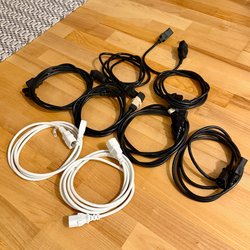 Fem strömkablar för elektronik. Kablarna är individuellt förpackade i plastpåsar.