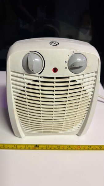 Elektrisk värmefläkt med två rattar för inställningar. Den ena ratten styr termostaten och den andra har tre lägen: fläkt, värme 1 och värme 2. En röd indikatorlampa lyser när värmefunktionen är aktiv. Fläkten är kompakt och enkel att placera.