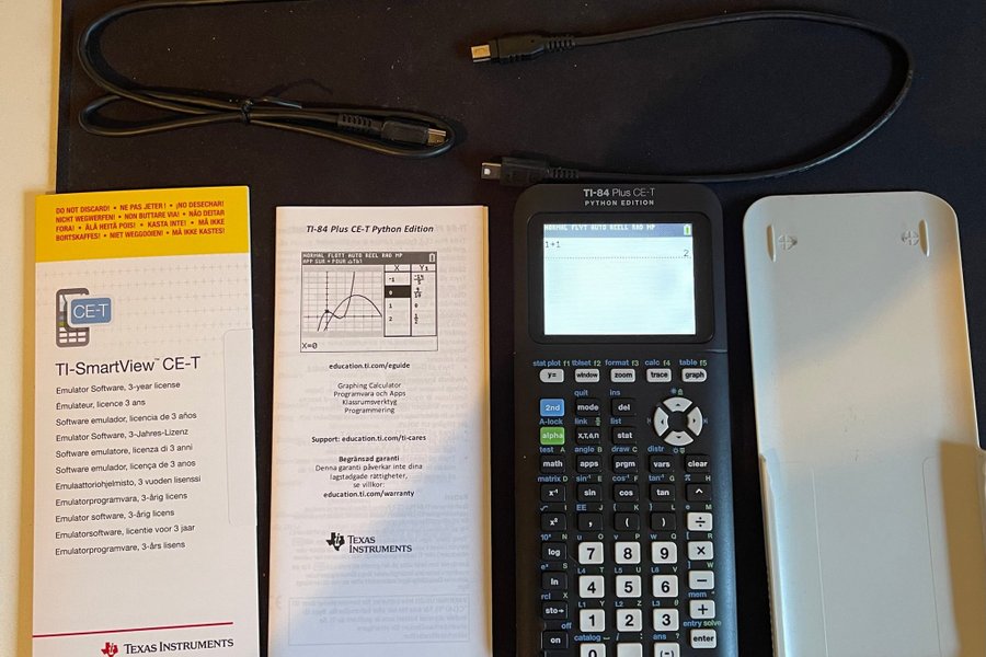 Texas Instruments TI-84 Plus CE-T Python Edition grafräknare. Inkluderar TI-SmartView CE-T emulatorprogramvara. Levereras med två kablar. Säljes i befintligt skick, varsamt använd.