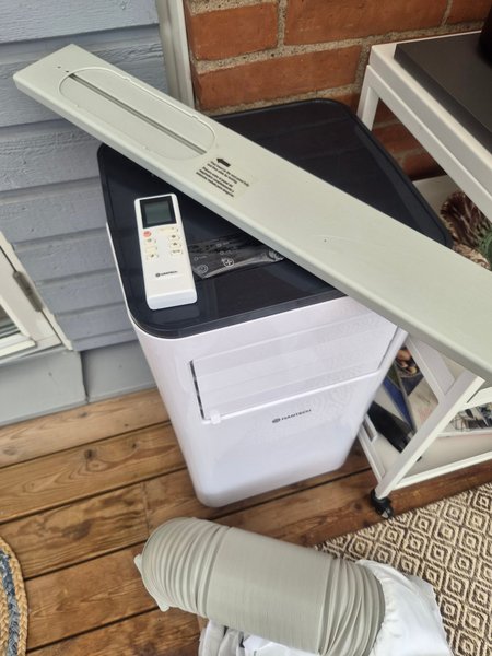 Portabel AC från Hantech. Enheten kommer med fjärrkontroll och frånluftsslang. Fjärrkontrollen har knappar för ström, lägesval, fläkthastighet (hög/låg), timer samt temperaturjustering. Frånluftsslangen är utdragbar och ansluts till ventilen.