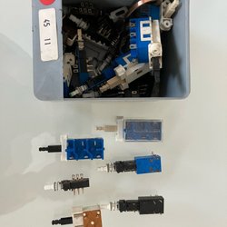Diverse elektronikkomponenter säljes. Innehåller bland annat högtalare, transformatorer, tryckkontakter och andra elektroniska delar. Perfekt för den som gillar att bygga och experimentera med elektronik.