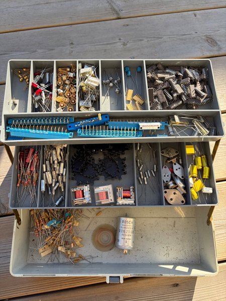 Parti med diverse elektronikkomponenter inklusive motstånd, kondensatorer, transistorer, dioder, reläer och kopplingsplintar. Innehåller även integrerade kretsar och en Bosch blinkgeber 6V 2x18W.