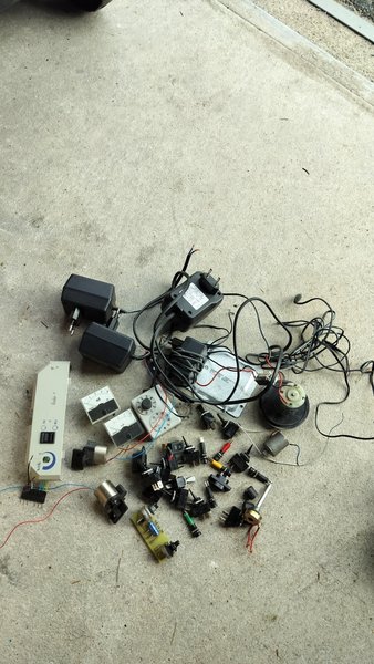 Diverse elektronik komponenter säljes. Inkluderar transformatorer, strömadaptrar, motorer, mätinstrument, omkopplare, potentiometrar och kretskort.