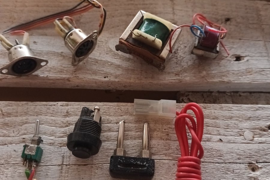 Parti med diverse elektronikkomponenter. Inkluderar två transformatorer, två DIN-kontakter, en tryckknapp, en banankontakt och en röd kabel.