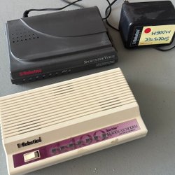 Detta parti innehåller ett urval av elektronikkomponenter och utrustning. Bland objekten finns olika typer av strömförsörjningsenheter, inklusive en DC Power Supply OL 534D 5V 500mA från Oltronix, en Gould MG 15-8 B med 220-240V input och 15V 8A output, samt en Melcher LSR 3005-7iPCD Chopper Power Supply med 5V DC output. Dessutom ingår en Esselte 3V adapter, en Metric kontrollpanel med knappsats och display, en liten skrivare med pappersrulle, diverse transistorer monterade på kylflänsar, en ”Studsfri Kontakt”-enhet, en Helipot Precision Potentiometer modell T-10-A, en potentiometer märkt ”k ohm SERIE”, en Westermo Access MA-42 modem/router, samt en låda med blandade elektroniska delar och kablar.