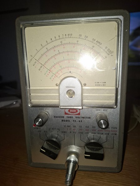 Tech rörvoltmeter, modell TE-65. Instrumentet har funktioner för mätning av DC. RMS 1.5V, 5V, 15V, 50V, 150V, 500V, 1500V samt P-P 4V, 14V, 40V, 140V, 400V, 1400V, 4000V. Ohms mätområden inkluderar R X10, X100, X1K, X10K, X100K, X1M, X10M. Enheten har justeringsrattar för "ZERO ADJ." och "OHMS ADJ.", samt en omkopplare för "POWER OFF ACV DCV".