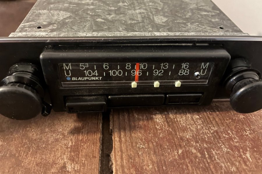 Blaupunkt bilradio med analog frekvensvisning. Radion har rattar för justering och knappar för förinställda stationer. Det verkar ha suttit något limmat på två av tryckknapparna. Ej testad, men bör fungera.