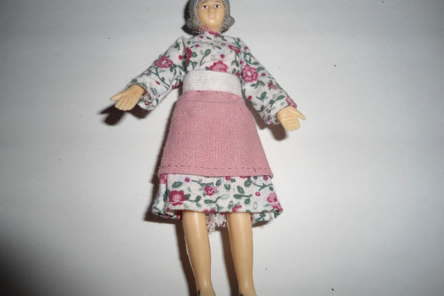 En dockskåpsdocka i klänning med blommor och förkläde. 10 cm