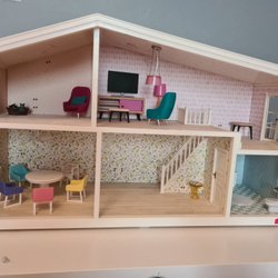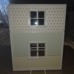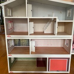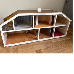 Ett charmigt Lundby dockhus med flera rum och en balkong. Dockhuset har unika tapeter och färgsättningar i varje rum, vilket ger det en personlig touch. Perfekt för lek och inredning.
