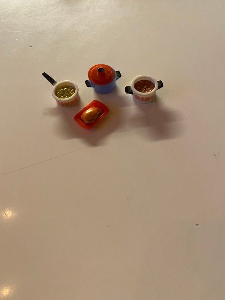 Set med leksaksmat i miniatyr. Innehåller kastruller, stekpanna och mat. Lundby 70-80 tal.