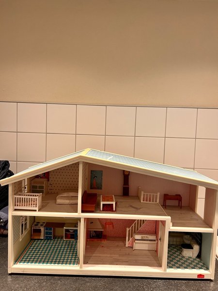 Ett klassiskt Lundby dockhus med diverse möbler.