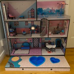 Ett charmigt dockhus i rosa och vitt med grått tak. Tror att det är Melissa and Doug. Huset är möblerat med diverse möbler för olika rum, inklusive sovrum, vardagsrum, badrum och matplats. Perfekt för fantasifulla lekar. Se sista bilden, losnat bit på taksidan.