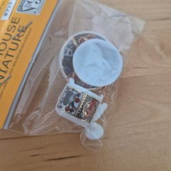 Miniatyr dockservis i trä och metall. Inkluderar tallrikar, koppar, skålar, en guldfärgad kanna och små glas.
