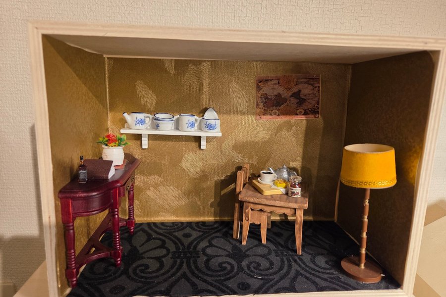 Ett charmigt miniatyrdockskåp med detaljerad inredning. Inkluderar möbler som bord, stolar, en lampa och diverse små föremål som porslin och dekorationer. Perfekt för samlare eller som en unik inredningsdetalj.