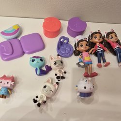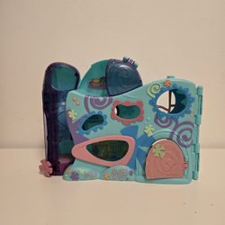 Dockhus i plast med flera rum och utfällbara sektioner. Huset är rosa och lila med gula och gröna detaljer. Det har fönster, balkong och en inbyggd köksdel.