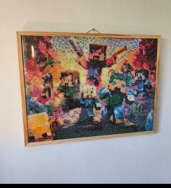 Stor handgjord pärlplatta med Minecraft-motiv, ca 60×30 cm.
