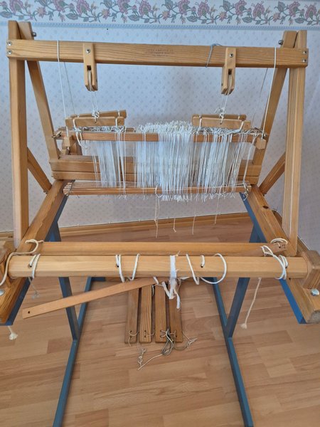 Vävstol i trä med vita trådar uppspända. Vävstolen har detaljer i trä och metall, samt vita snören och remmar. Tillverkad av "IDJA-ASKLING AB MOHEDENBERG SWEDEN".