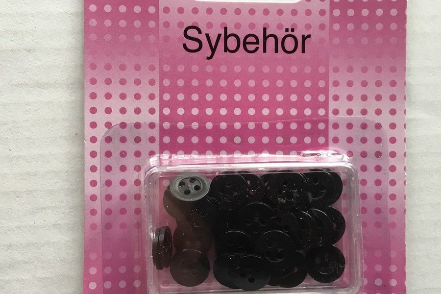 En förpackning med 40 st svarta knappar ca 1 cm i diameter.