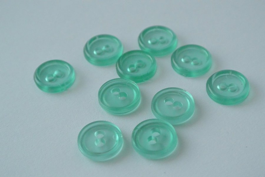 Knappar av plast, 11 mm. Ljus mintblå. Förp. med 10st.