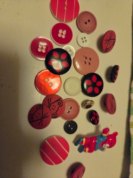 Ett sortiment av knappar i olika färger och former, inklusive röda, svarta, vita och bruna. Vissa knappar har mönster som blommor och björnar. Det finns även en dekorativ brosch i form av en björn.