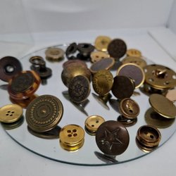 Sælger disse 7 fine guldfarvede metalknapper. De har et smukt, detaljeret mønster, der ligner filigran. Perfekte til et syprojekt, en frakke, blazer, eller hvis du mangler erstatningsknapper.