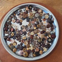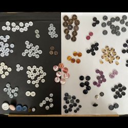 Massor av knappar! I nyanser av grått och svart. Av plast, metall, tyg och även glas; och de görs nog inte nuförtiden! Vikt ca 920g