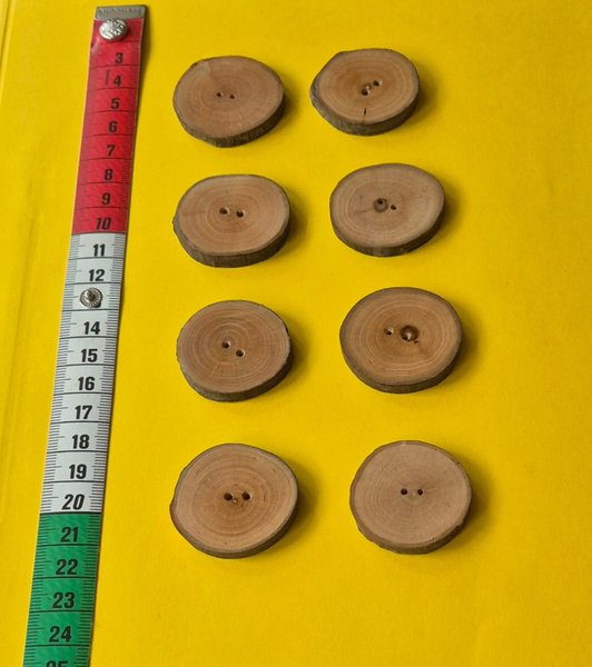 Åtta stycken knappar gjorda av trä.Har två hål för fastsättning.De är oanvända.