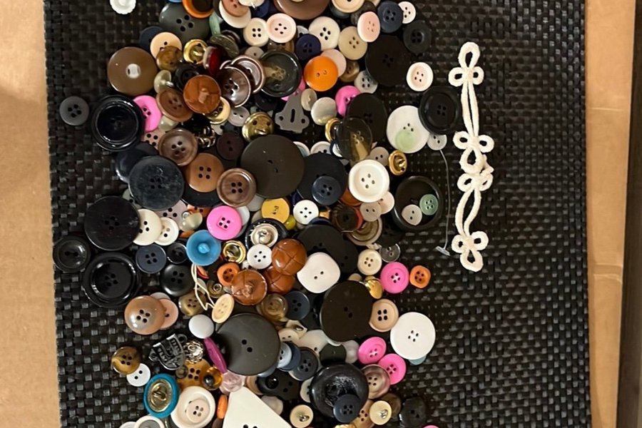 Ett stort sortiment av knappar i olika färger, former och storlekar. Inkluderar även en vit dekorativ sladd.