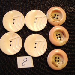 Ett set med 12 runda knappar. De flesta knapparna är rosa med mörkrosa ränder. Några knappar är vita. Varje knapp har två hål för fastsättning.