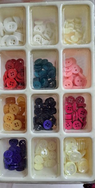 Färgglada knappar enligt bild. Minst 20st per färg säljes I befintligt skick