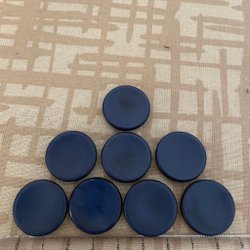 Knappar, svarta och mörkgrå. Tre stora (3 cm i diameter), två små (2,5 cm i diameter).