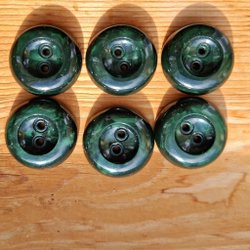 Ett set med 11 gröna knappar med guldfärgad kant. Varje knapp mäter ungefär 1.5 cm i diameter.