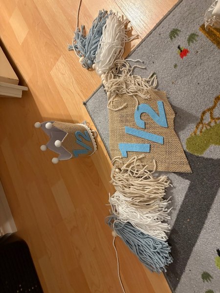 Ett sött dekorationsset för att fira en liten persons 1/2 årsdag. Inkluderar en vimpel och en krona.