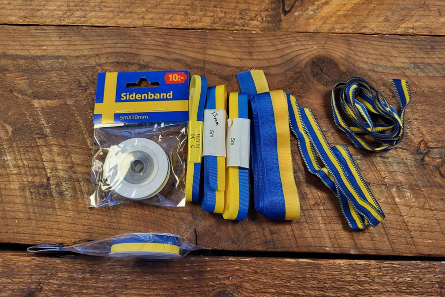 Sverigeband 10, 15, 25 mm breda, olika längd.