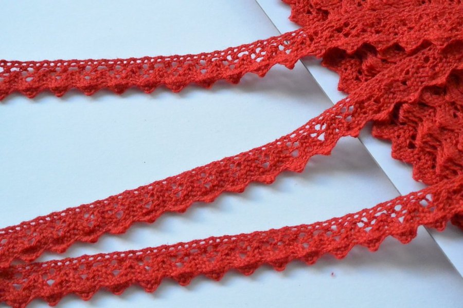 Spets av bomull, röd, bredd 15 mm.