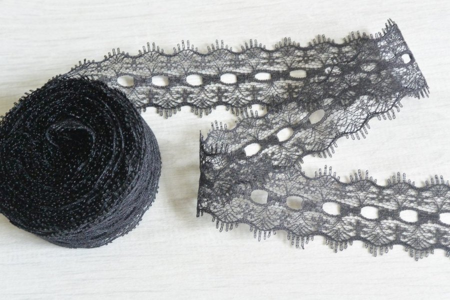 Svart syntetspets. 3,2 cm bred.