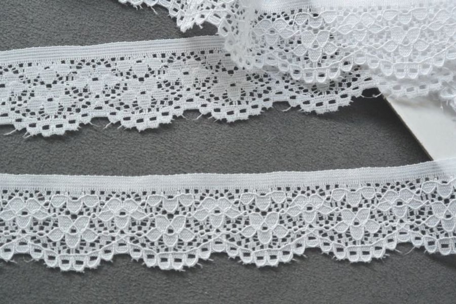 Elastisk spets. Vit. 2,5 cm bred.