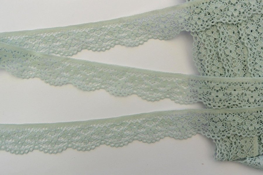 Elastisk spets. Ljus grågrön. 2,5 cm bred.