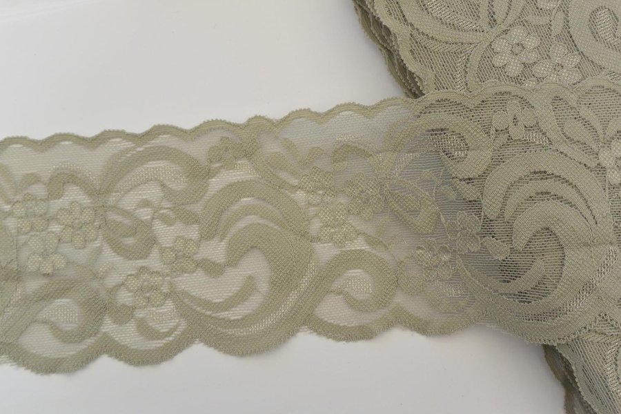 Gråbeige elastisk spets. 9 cm bred