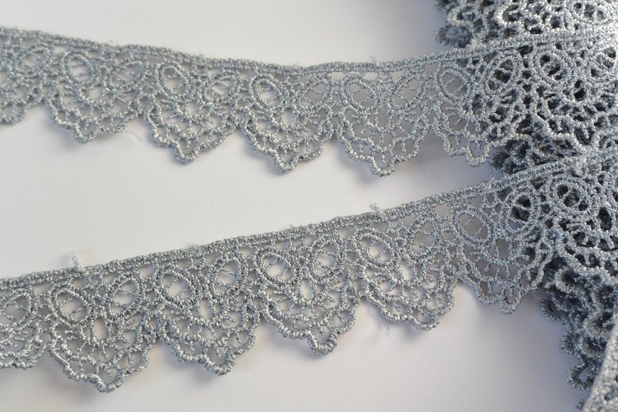 Grå spets. 3,3 cm bred. 76% viskos, 24% bomull