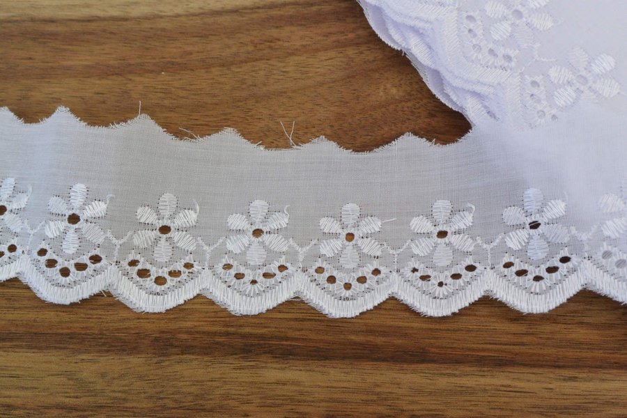 Vit brodyr i 100% polyester. Ca 30(50) mm bred