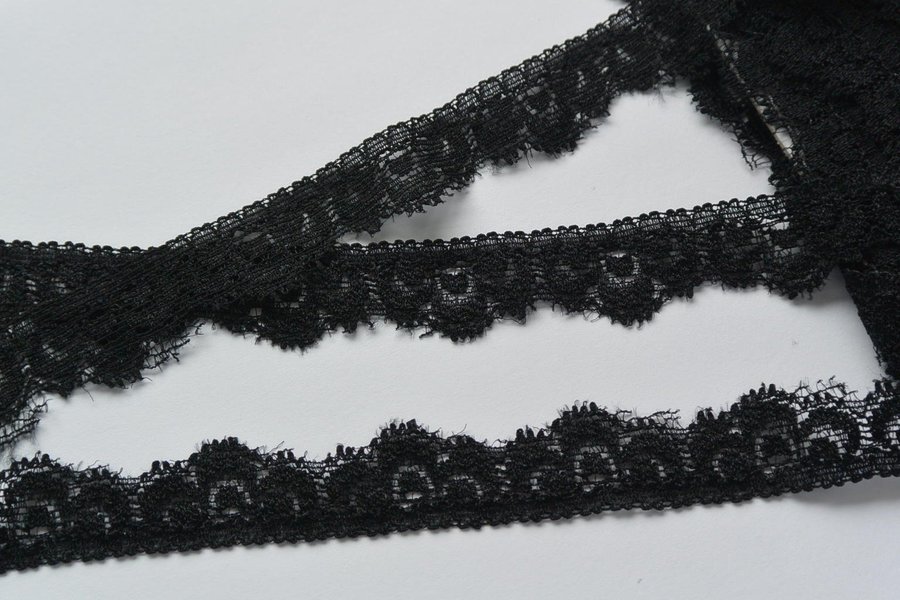 Svart elastisk spets. 1,6 cm bred.