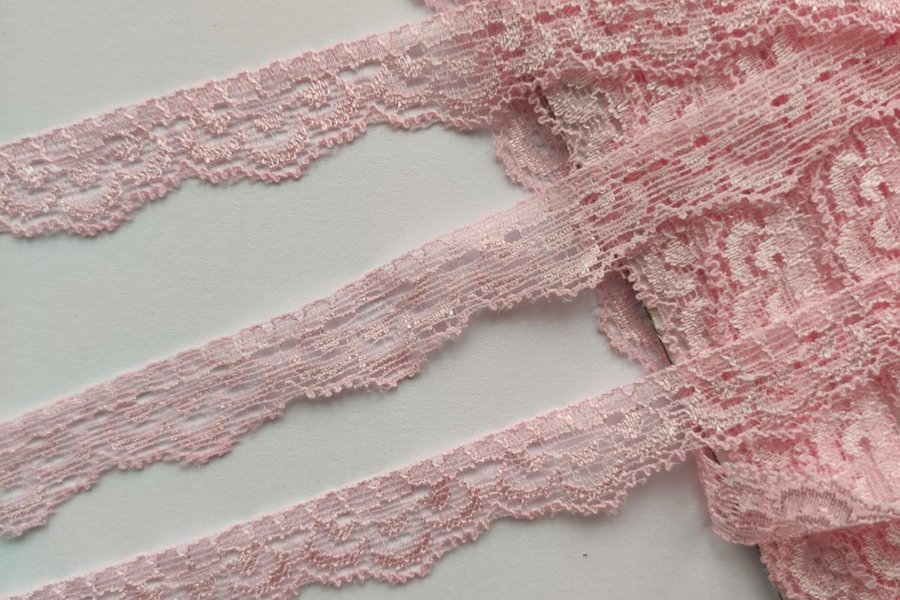 Ljusrosa elastisk spets. 1,6 cm bred.
