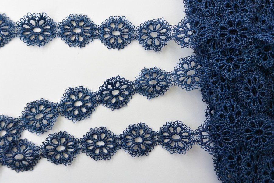 Marinblå spets. 25 mm bred. 76% viskos, 24% bomull.