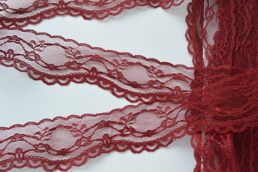 Spets i syntet. Vinröd. 42 mm bred.
